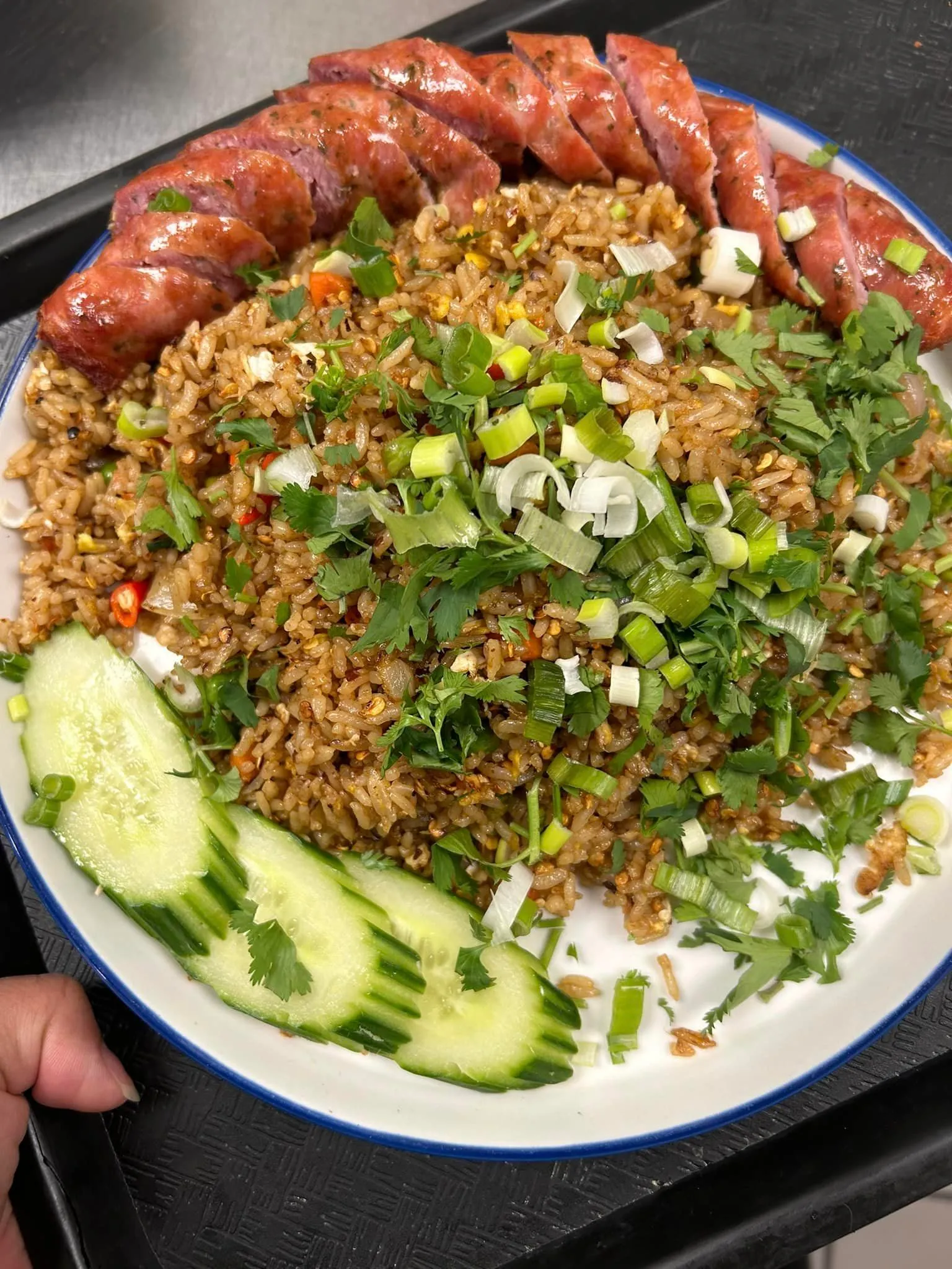 Lao Sausage with special fried rice with peas, carrots, onions, and eggs. Your choice of meat, topped with cilantro and green onion