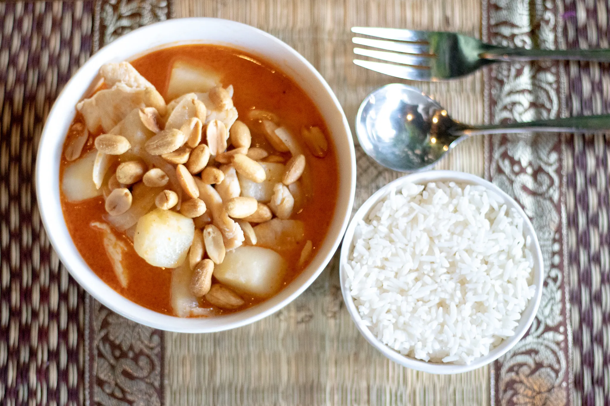 Potatoes and onions topped with peanuts. Your choice of protein, served with white rice.