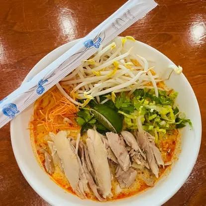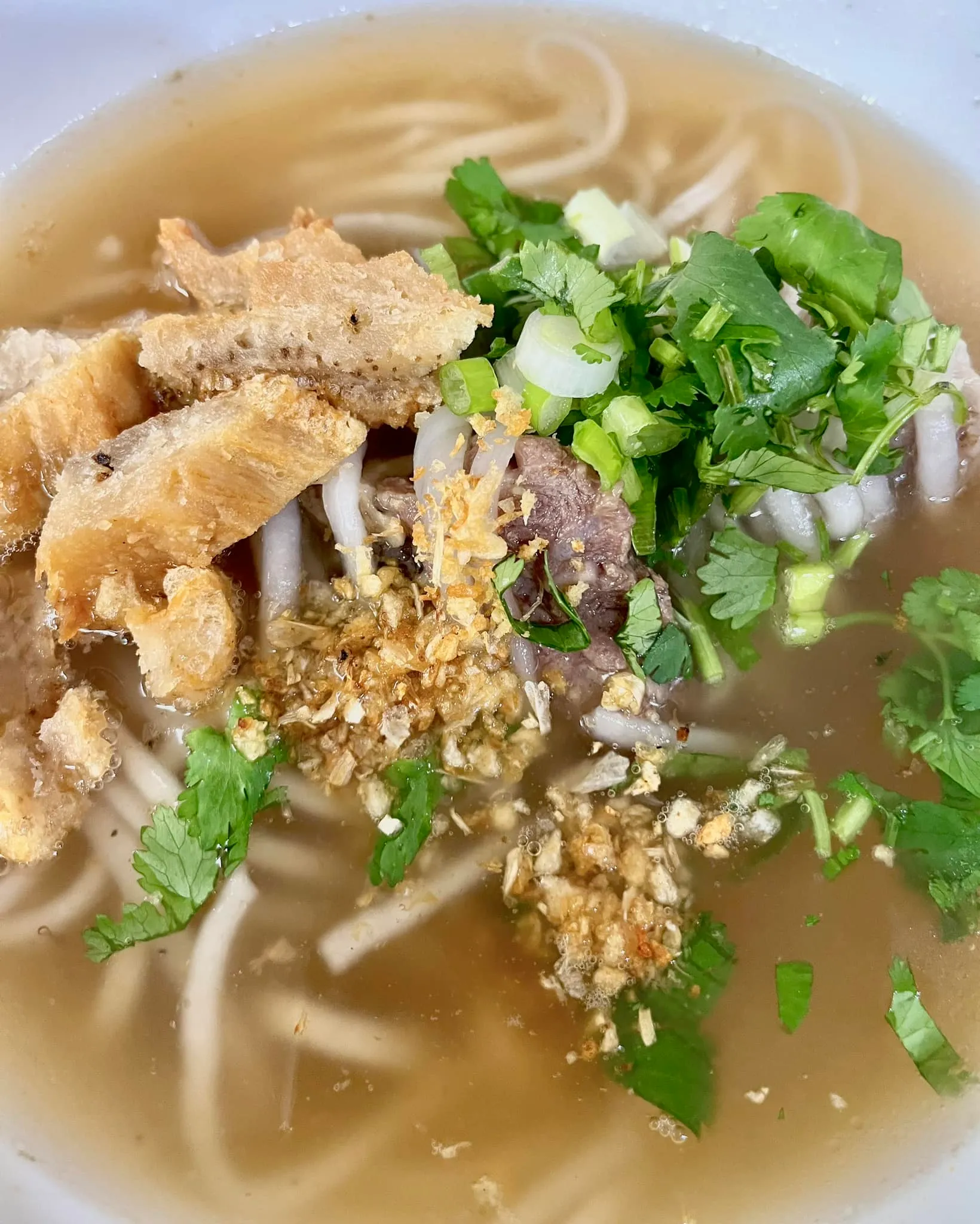 Rich, savory, beef broth served with rice noodles, bean sprouts, thai basil, green onion, and cilantro topped with fried garlic and pork rinds.