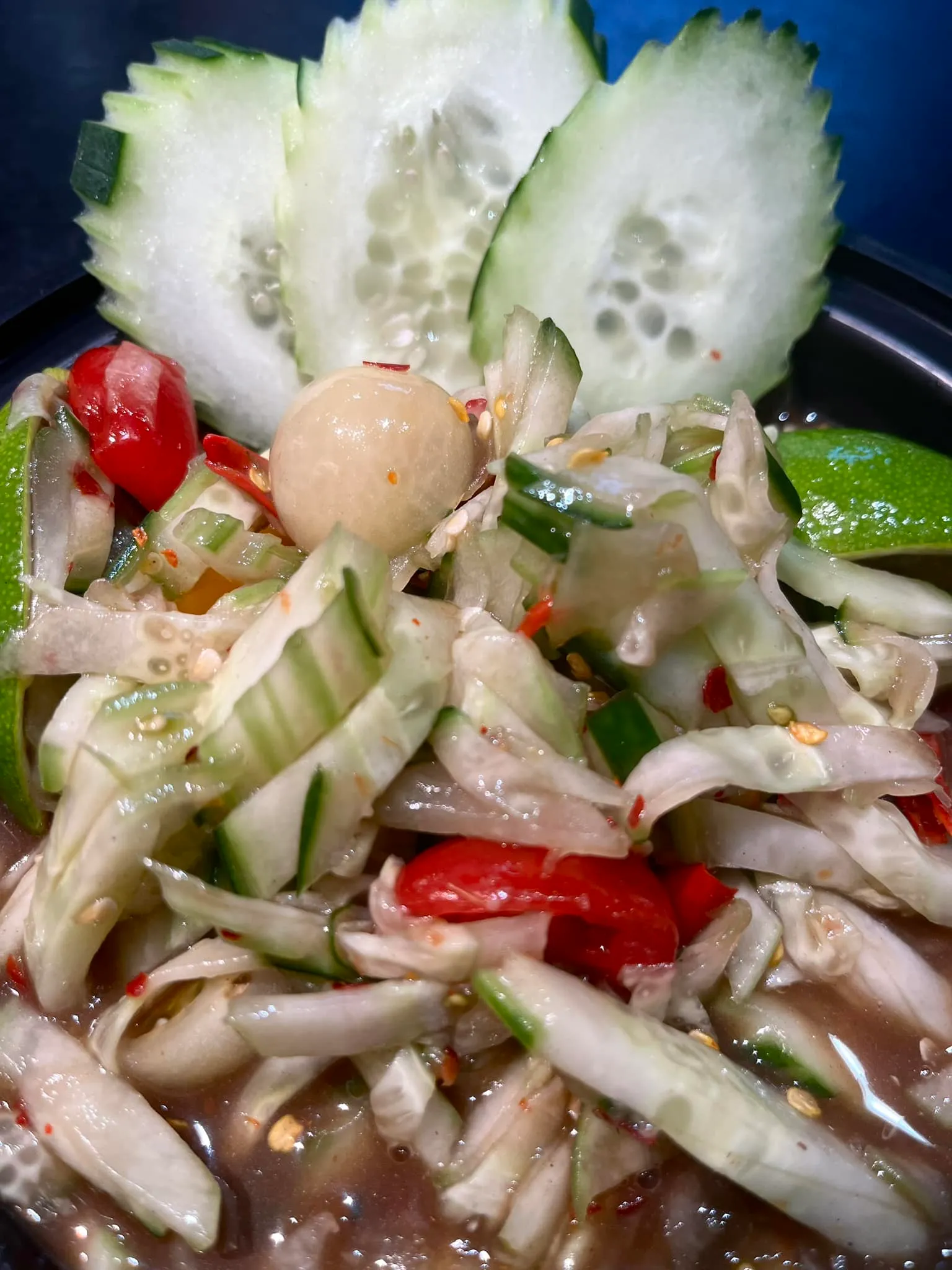 Lao Style.Cucumber salad, with tomatoes tossed in a fermented fish sauce.