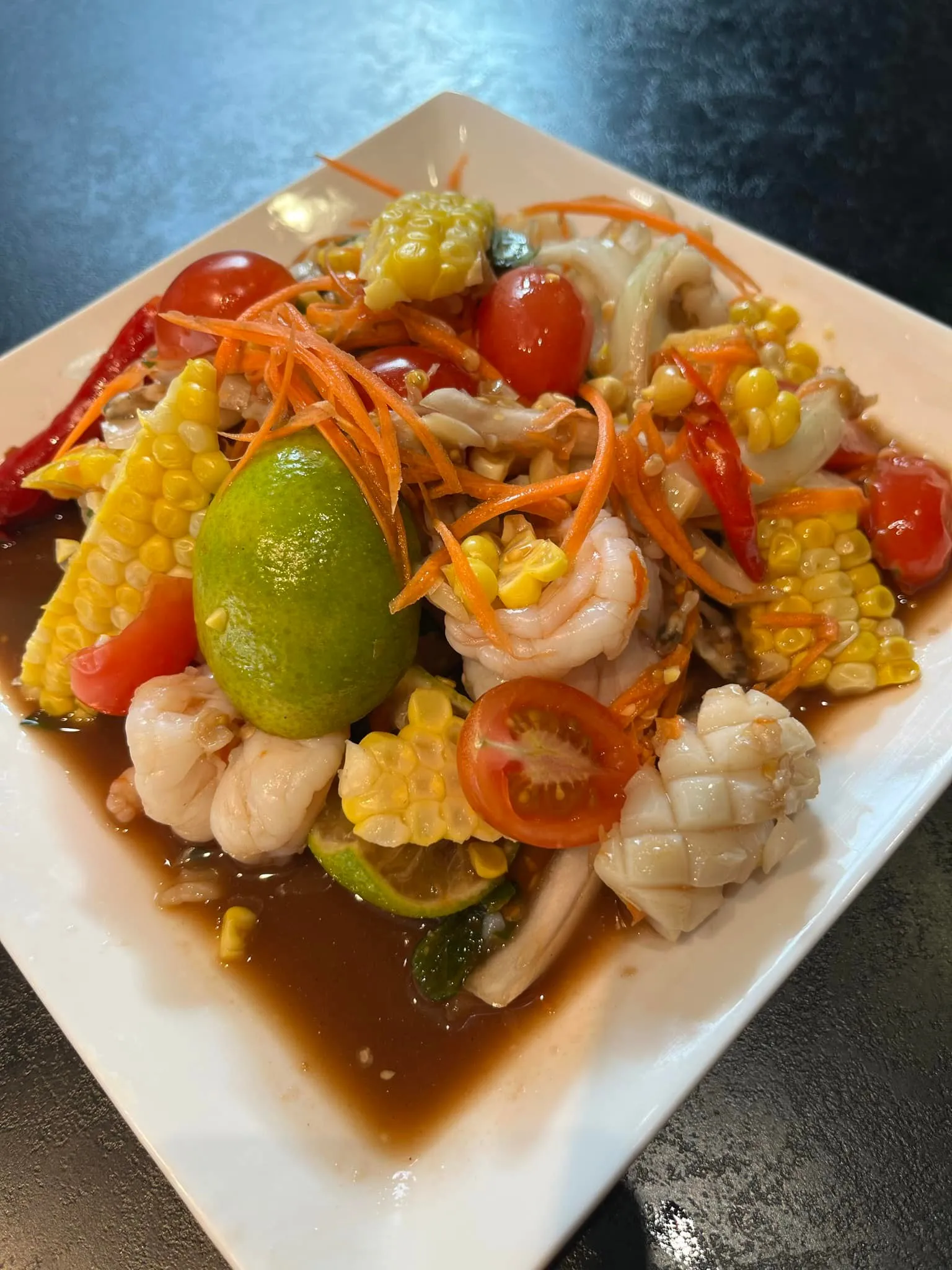 Seafood medley, basil, tomatoes, and shredded carrots tossed in a savory fermented fish sauce.