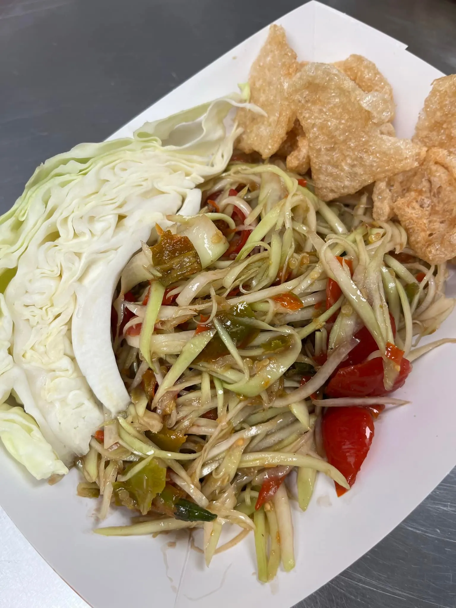 Papaya salad (Lao style) served with a side of vermicelli noodles and pork rinds.