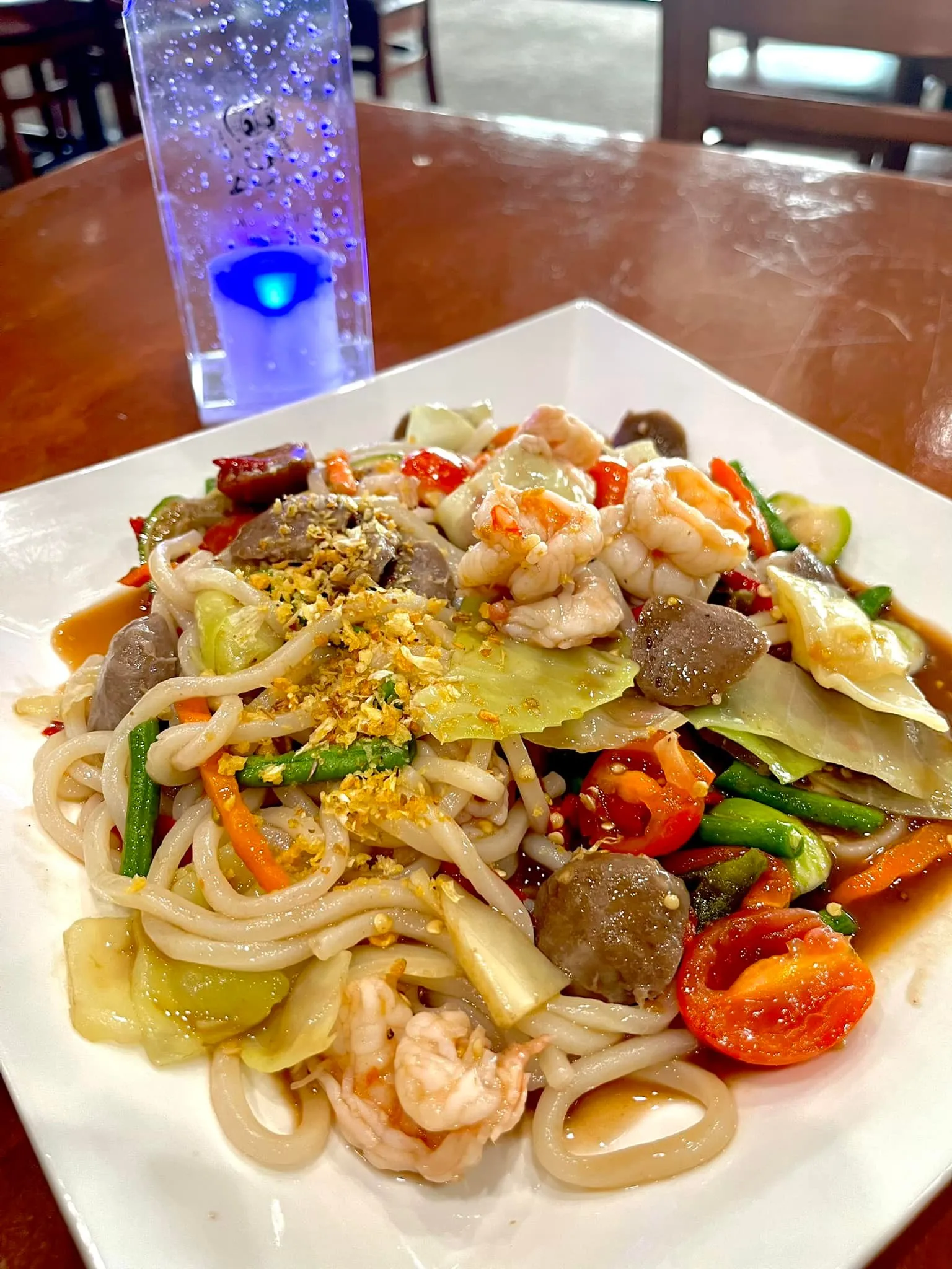 Lao Style.Kaopiak sen (udon noodles) mixed in with tomatoes, cabbage, seafood medley, and meatballs tossed into a savory, spicy, sauce.