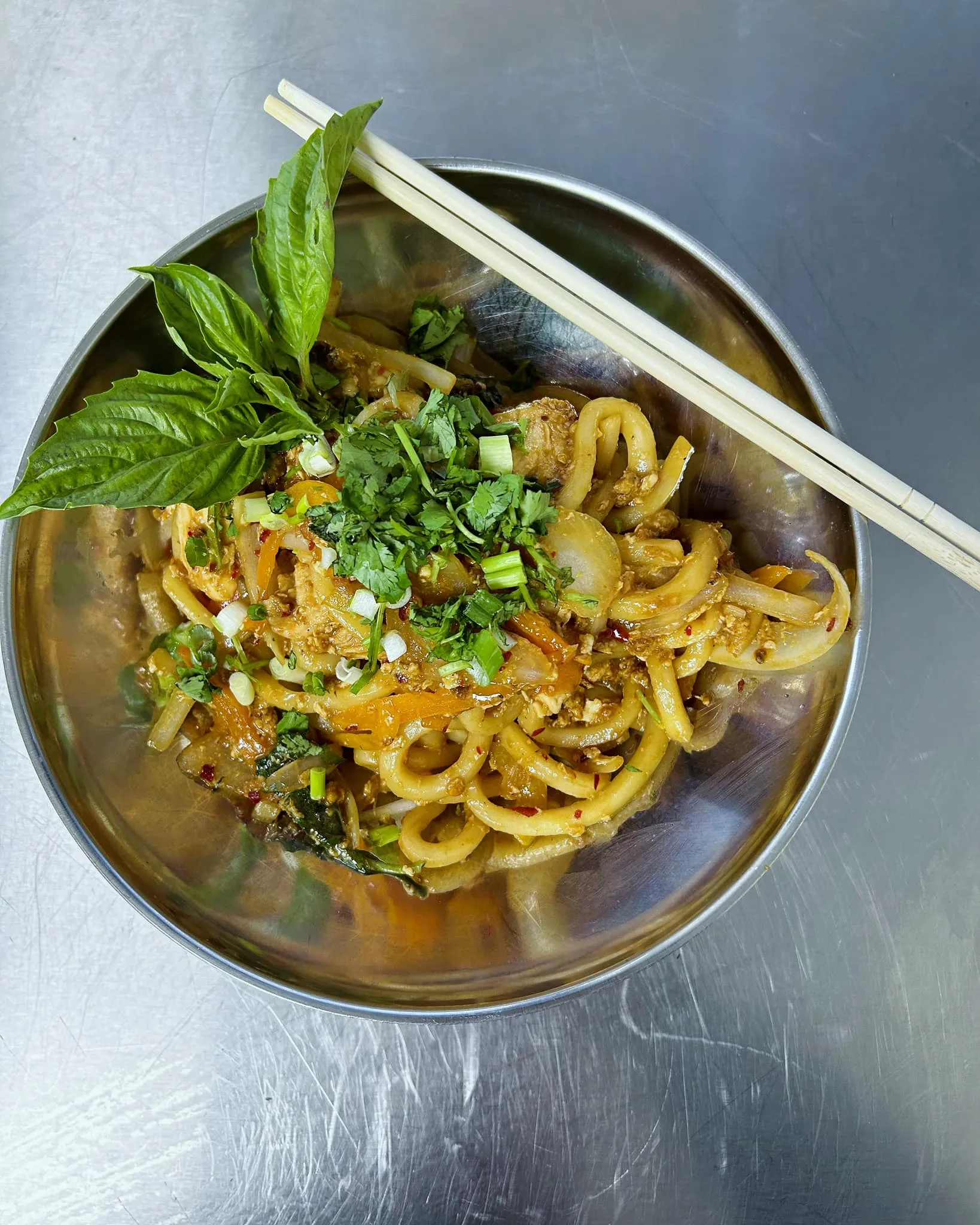 Lao Udon noodles with bell peppers, onions, eggs, and thai basil tossed in a rich, savory brown sauce
